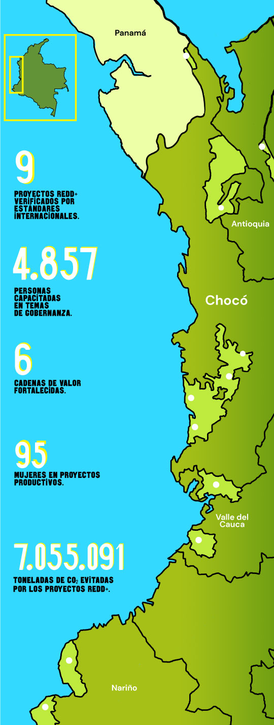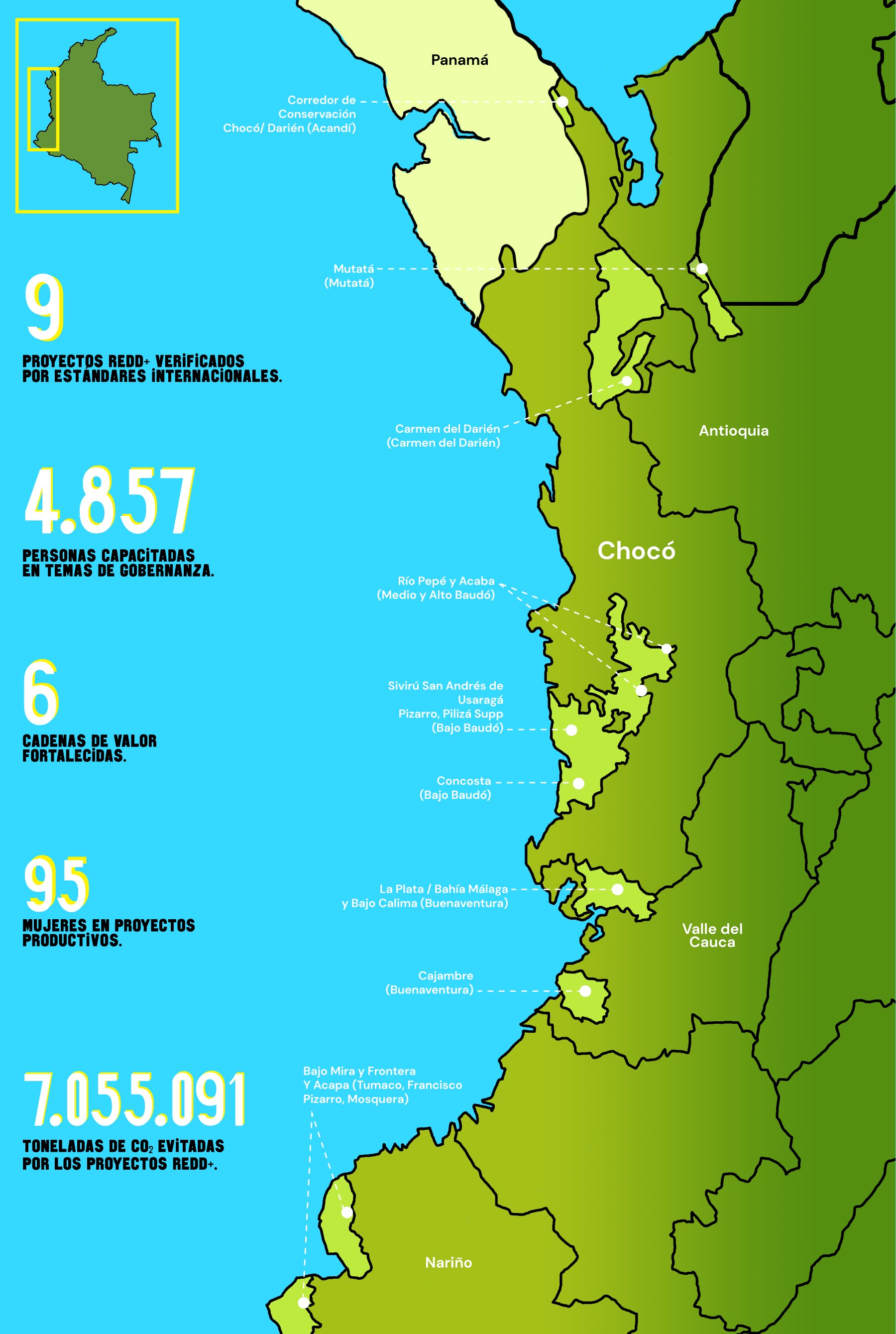 El Portafolio REDD+ comunitario está conformado por nueve proyectos REDD+, de 19 consejos comunitarios afrocolombianos y un cabildo indígena en el Chocó biogeográfico colombiano.